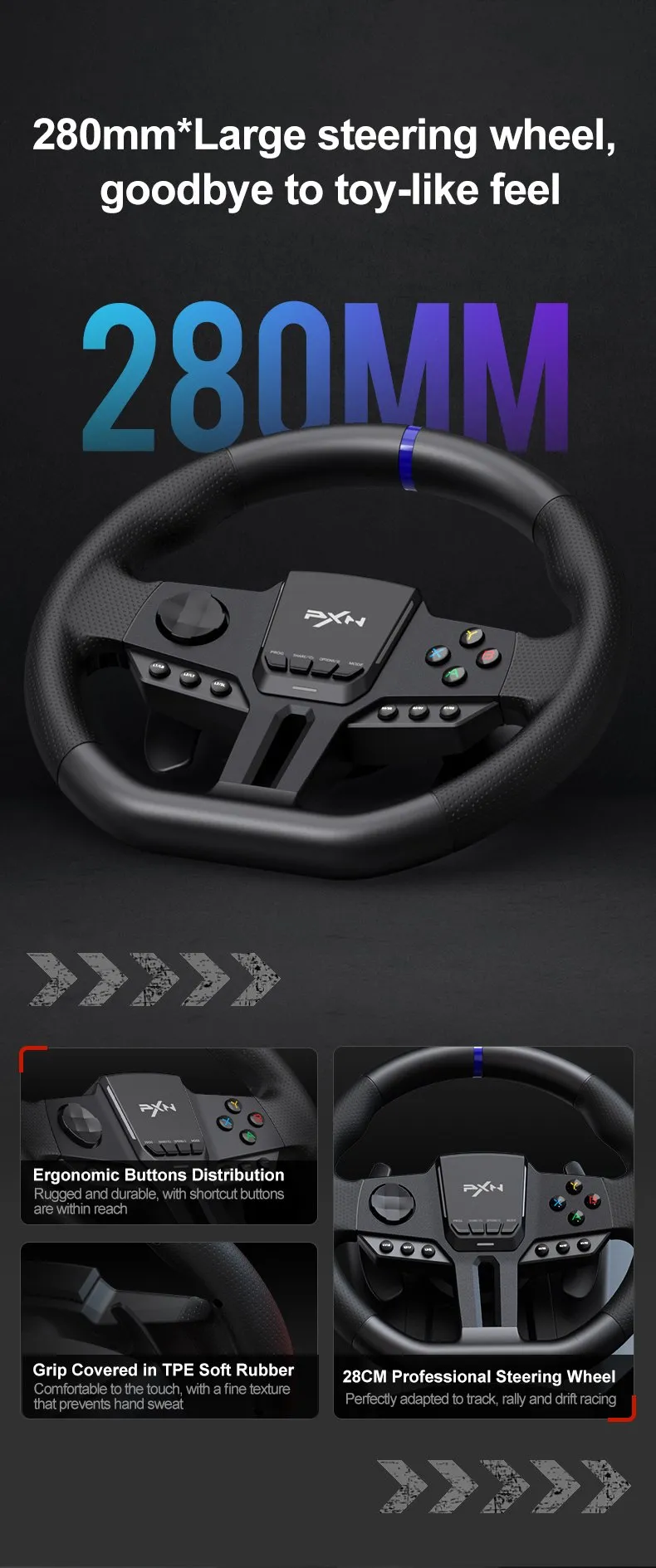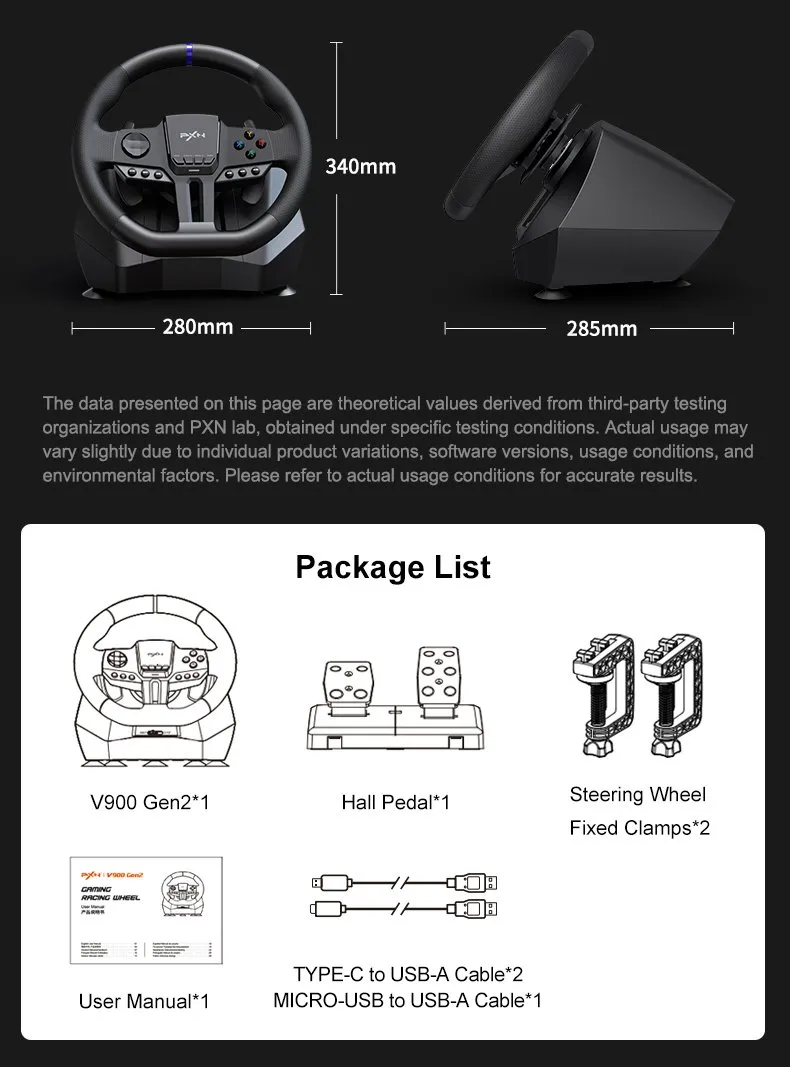 • 28cm (11-inch) professional steering wheel with 270°/900° switchable rotation angle.