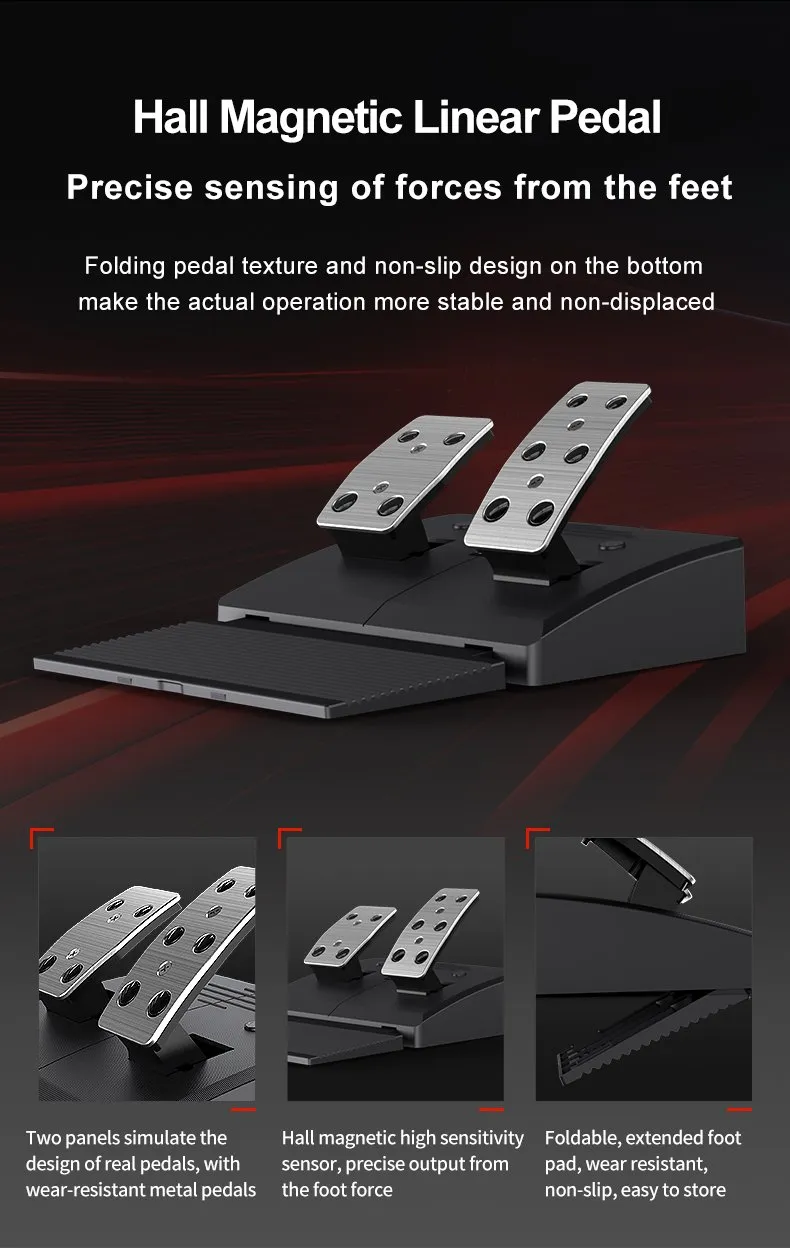• Includes Hall-effect 2-pedal set (throttle & brake) with non-slip folding design.